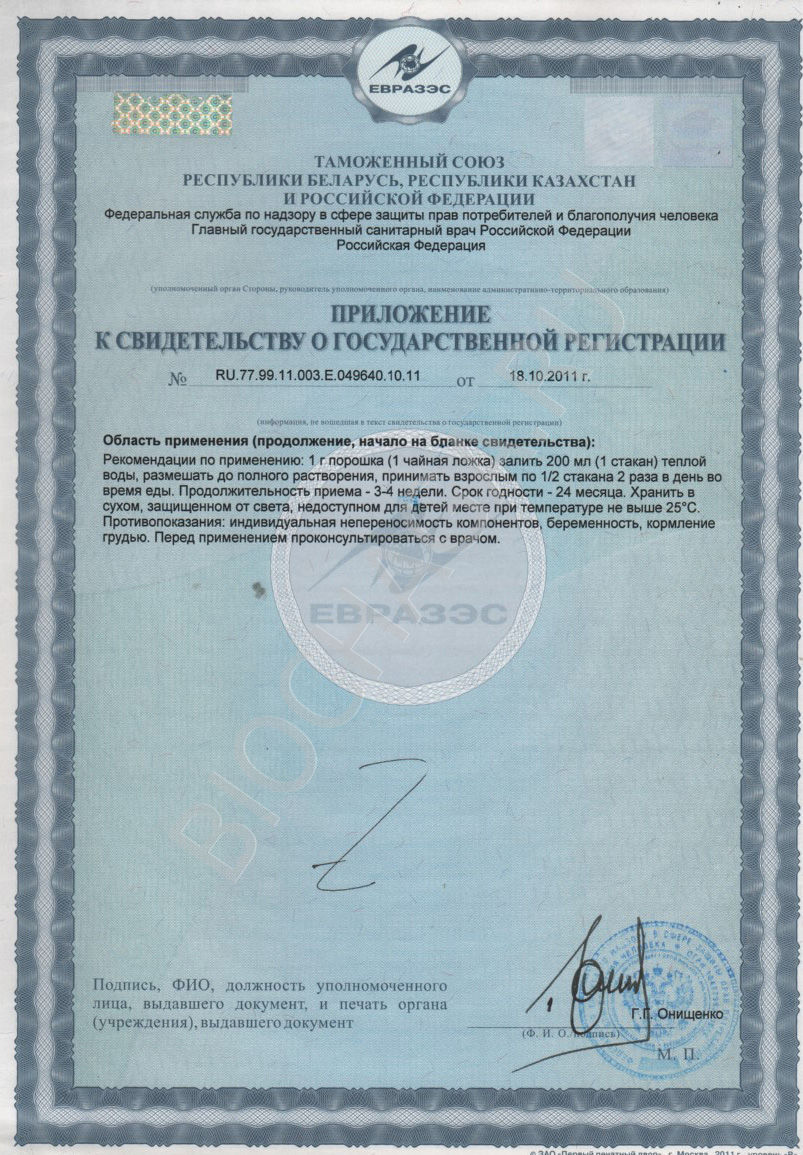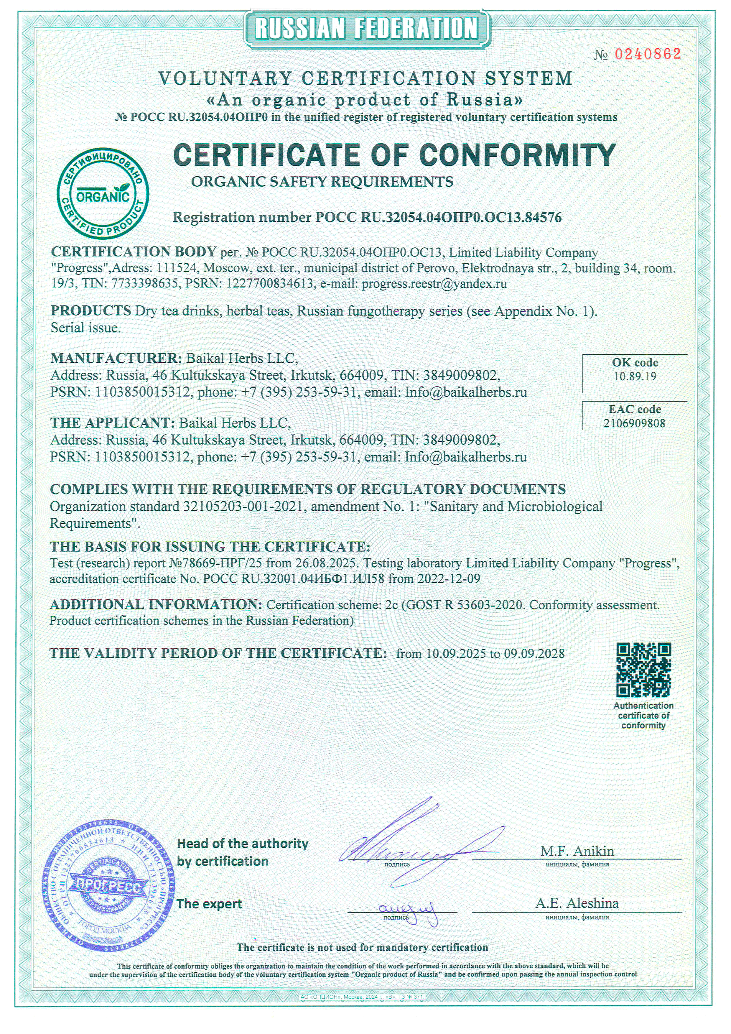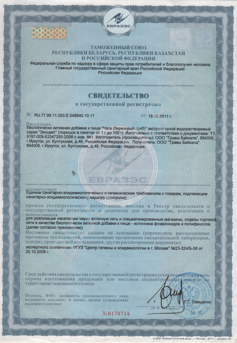 Certificate of Registration Approves chaga extract production in accordance with Russian Ministry of Health standards.