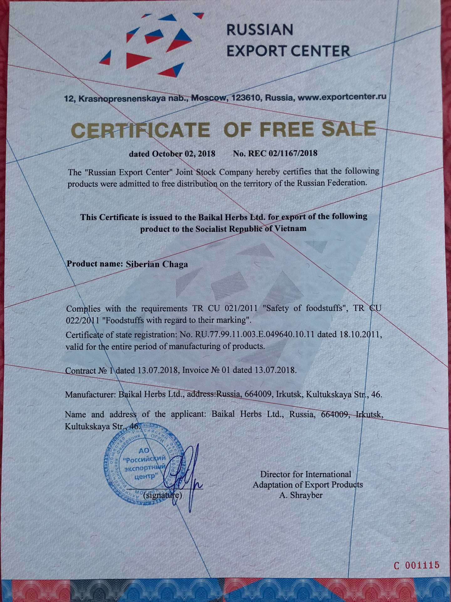 Confirms that our freeze-dried chaga extract is legally manufactured and freely sold in the country of origin, allowing export to international markets.